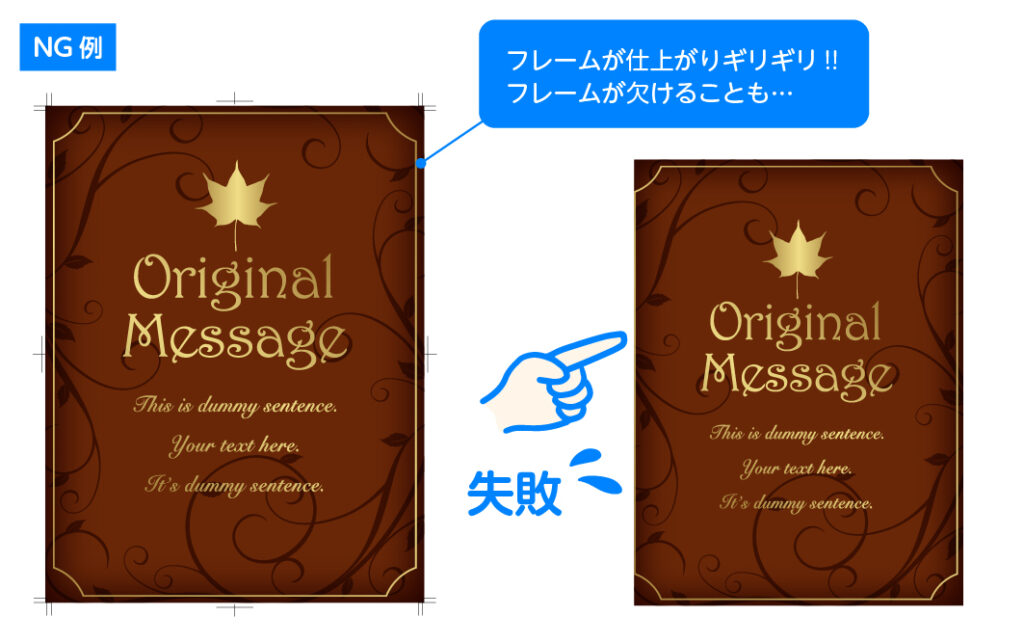 - 仕上がりサイズに収めるべき要素(文字など)が余白ギリギリになっていないか