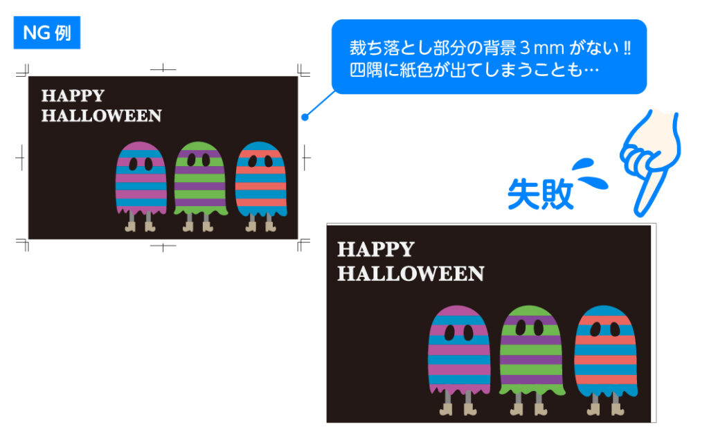 対策としては、IllustratorやInDesignなどの印刷向けソフトを使い、必ず裁ち落としを設定すること。