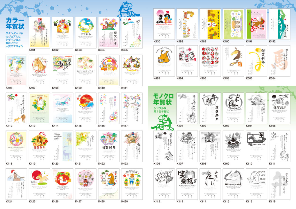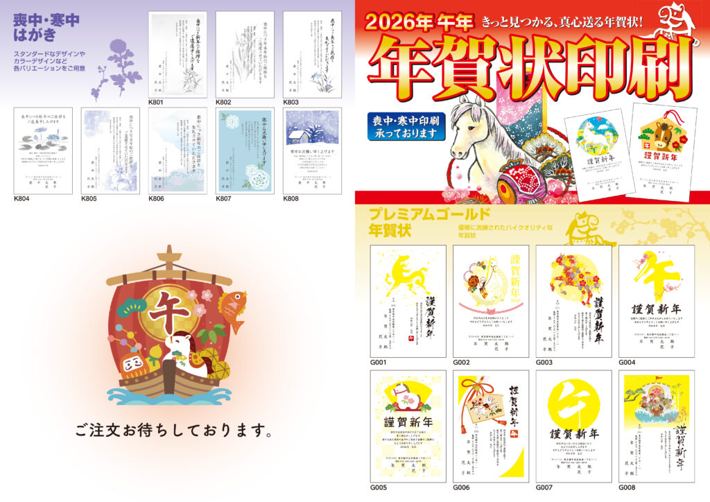 年賀状だけでなく、喪中・寒中はがきも受け付けていますので、いろいろ見ていただけたらと思います。また、年賀状ではゴールド(特殊な色です!)を使用したものもありますので、年明けを華やかにしてみるのも良いかもしれません。
