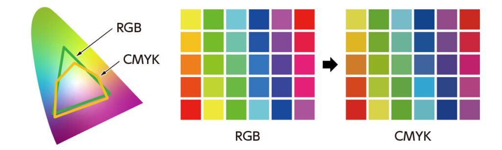 早速、調べてみるとRGBとCMYKでは表現できる色の範囲が違うことがわかりました。RGBは鮮やかな色を表現できるのに対し、CMYKはそれが難しいとのことです。